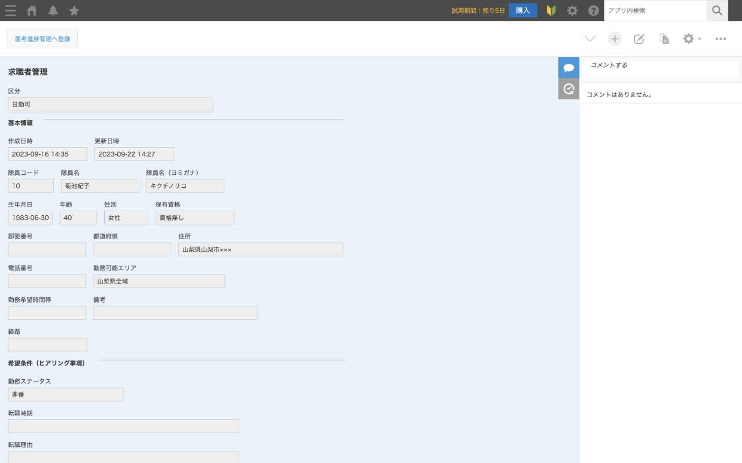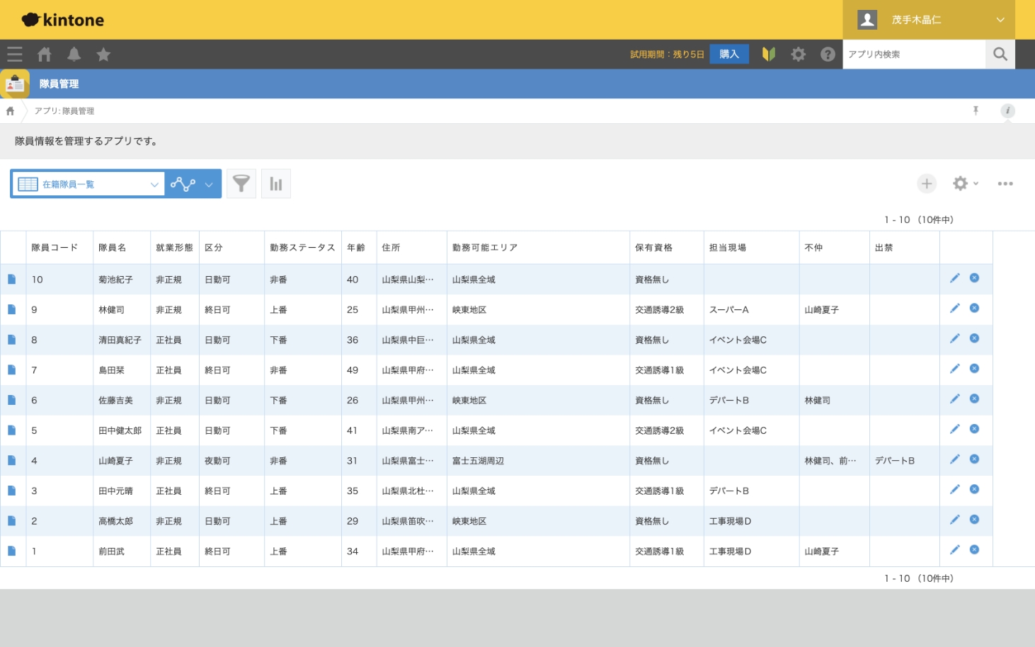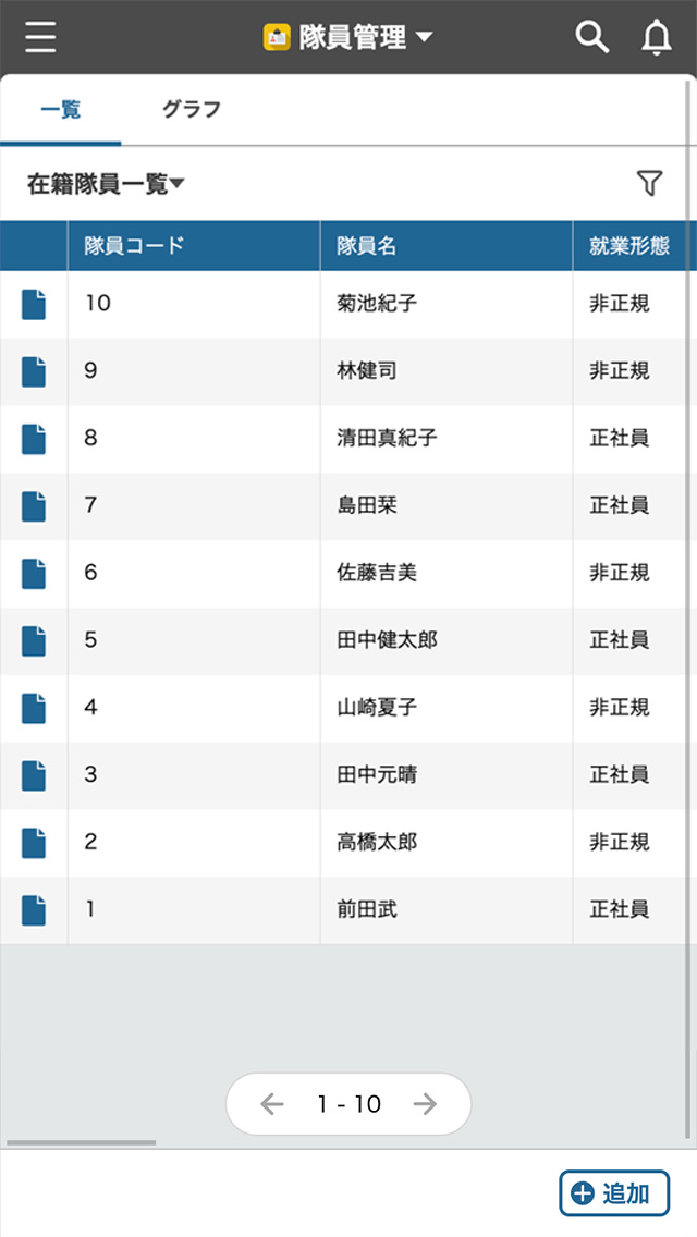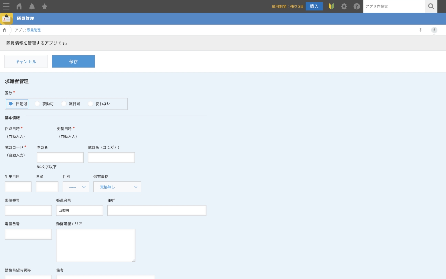 所属する隊員を登録し、各種情報の管理をすることができます。氏名などの基本情報だけでなく、不仲隊員、出禁顧客、資格者情報など現場ならではの必要情報も管理可能です。